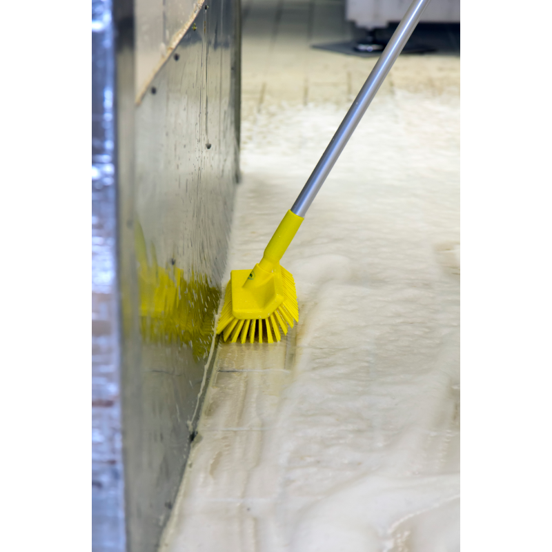Ergonomically designed handle improves the working position of the user with a comfortable grip, rounded top and hanger. Can be used with any product requiring a handle within the Vikan colour coded range. Do not use this handle with acid or chlorine.